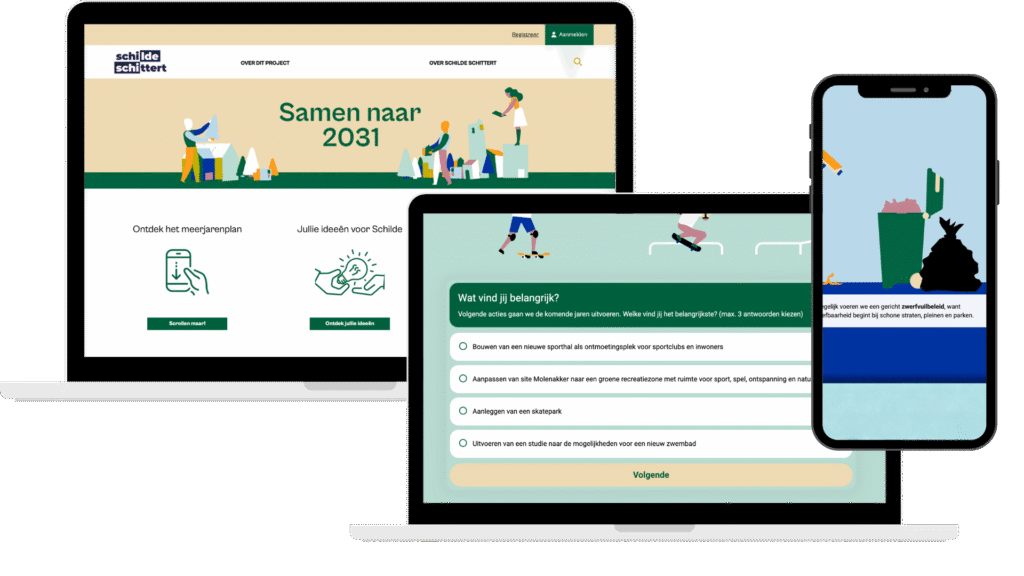 Daarom koos Schilde ervoor om haar meerjarenplan niet alleen te publiceren, maar écht te delen met haar inwoners. Dat doen ze op een heldere, visuele en laagdrempelig manier met Tell it. Daarnaast, in dezelfde flow, kunnen burgers ook input geven per actieplan, waardoor het meerjarenplan een echt ‘samen’ verhaal wordt. Hiervoor koppelen we Discuss it.